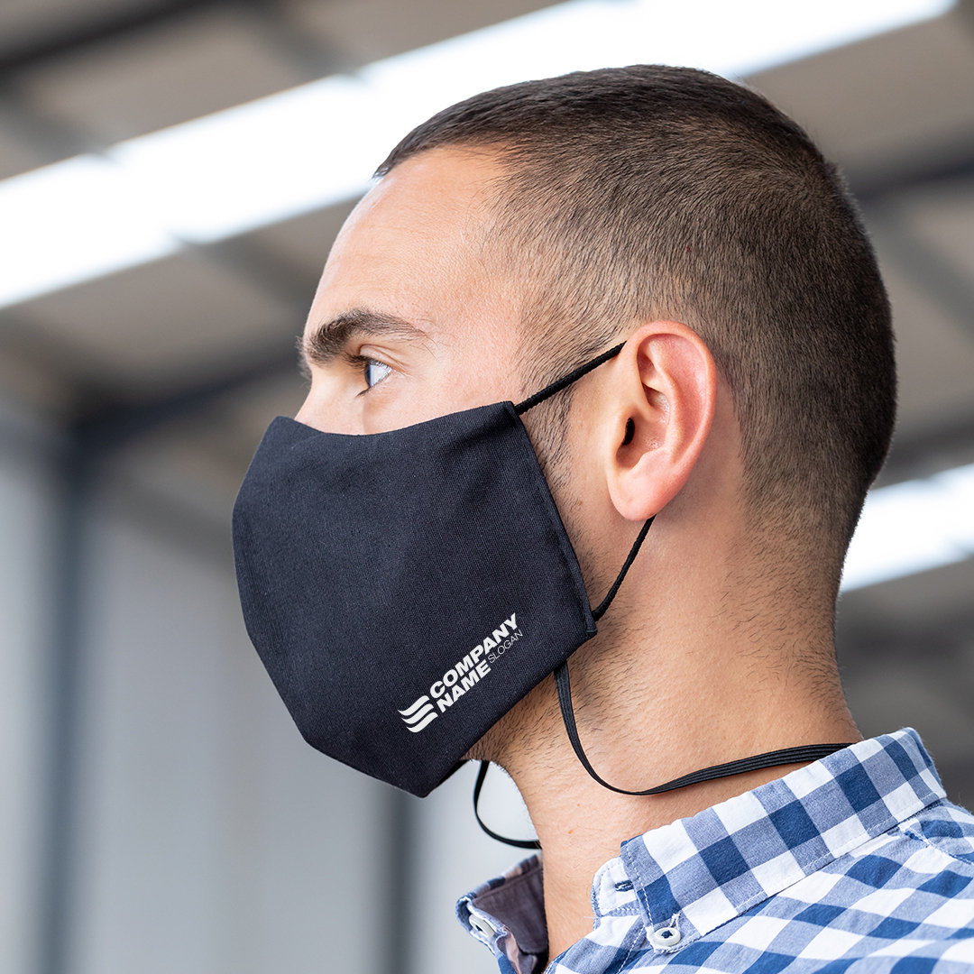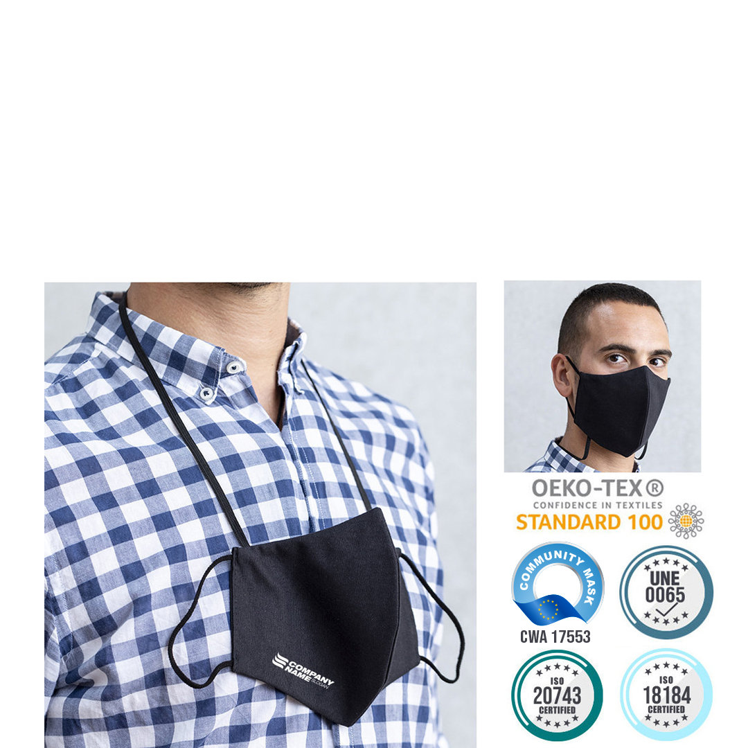 Mascarilla higiénica reutilizable con cinta elástica integrada para llevar en el cuello, permitiendo transportarla cómodamente y sin molestias. Al mismo tiempo, proporciona un rápido y fácil acceso a la mascarilla cuando es necesario usarla.