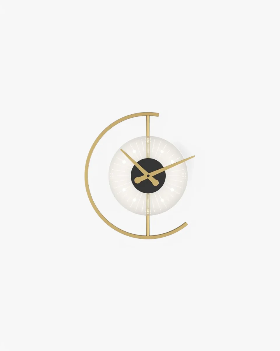 The Éclipse Glow wall lamp embodies a harmonious fusion of modern elegance and celestial inspiration. Its sculptural design, featuring a sleek golden arc embracing a luminous glass orb, mirrors the captivating beauty of an eclipse. The soft, ambient glow emitted through the intricately textured glass adds a touch of sophistication to any space.
