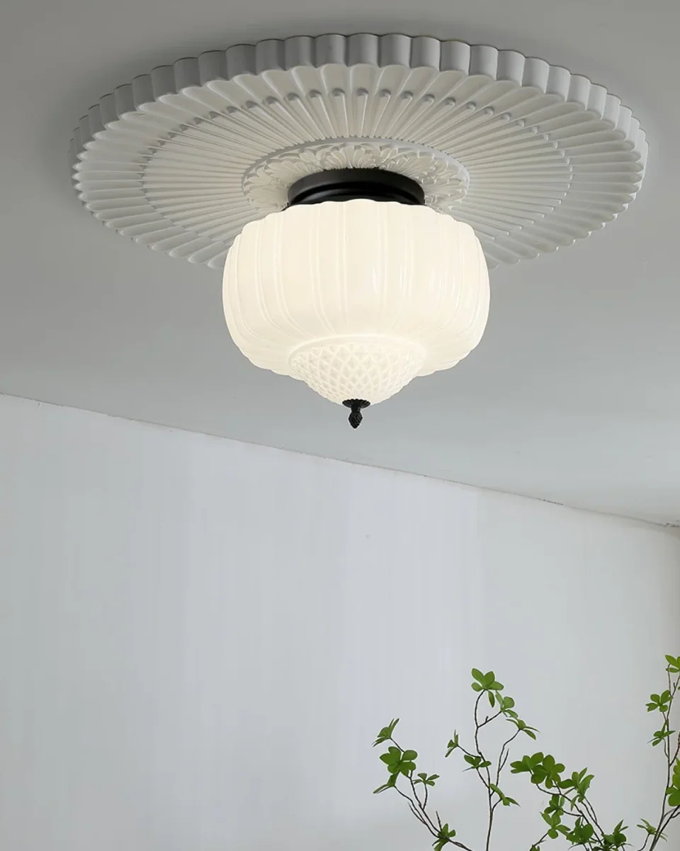 Inspired by the elegance of a blossoming bud, Le Bourgeon Éclairé brings a sophisticated and sculptural charm to your interior. This ceiling light is a celebration of heritage design and modern finesse, reimagined with bold contrast and delicate form. Handcrafted with a fluted white glass shade and finished with dramatic black accents, it makes a captivating addition to hallways, entryways, bedrooms, or dining spaces.