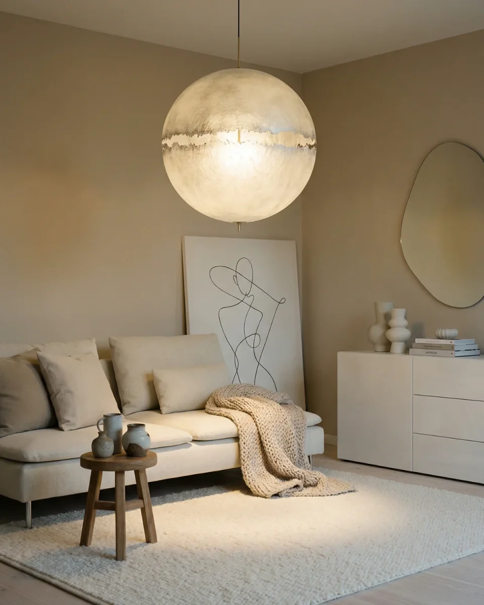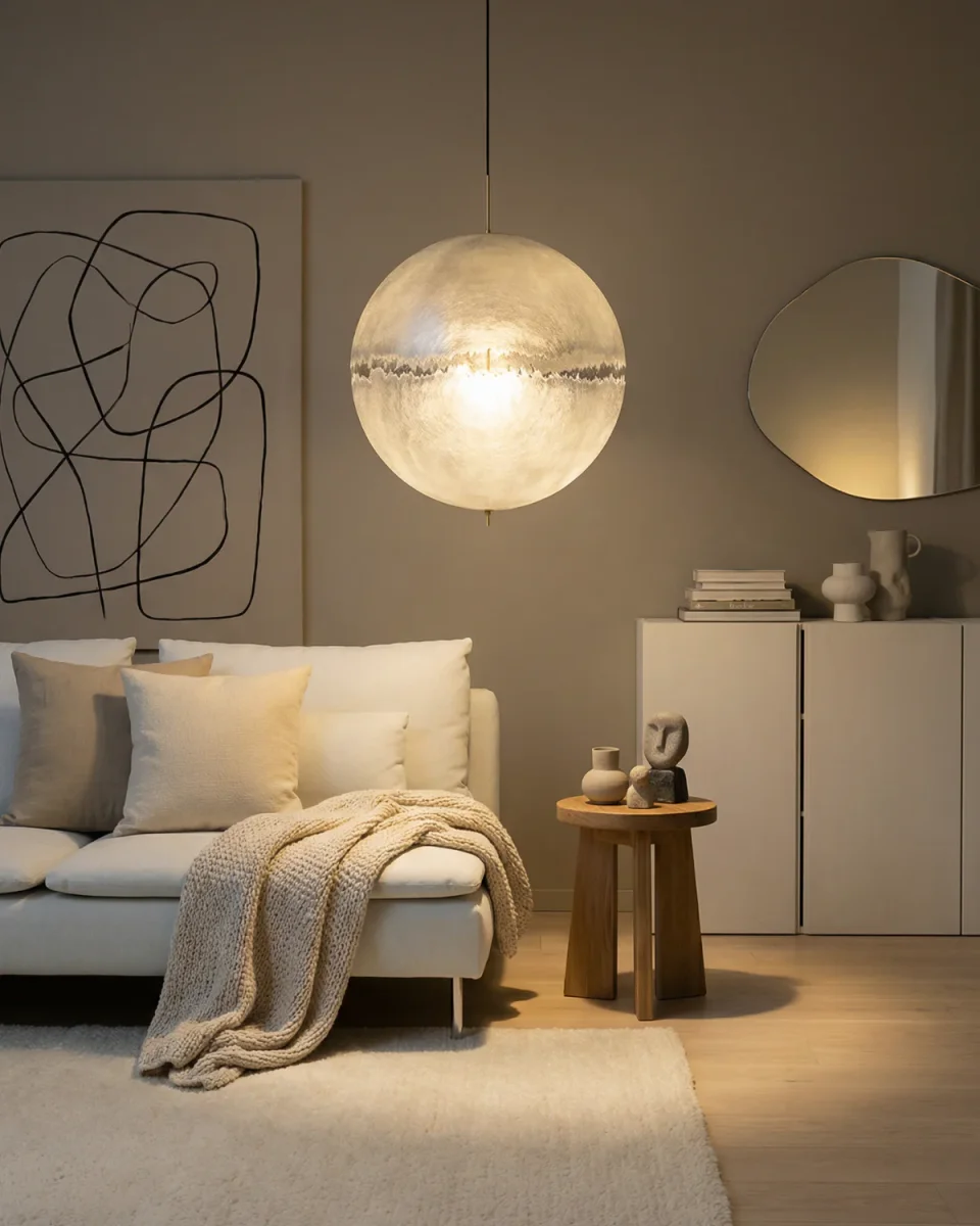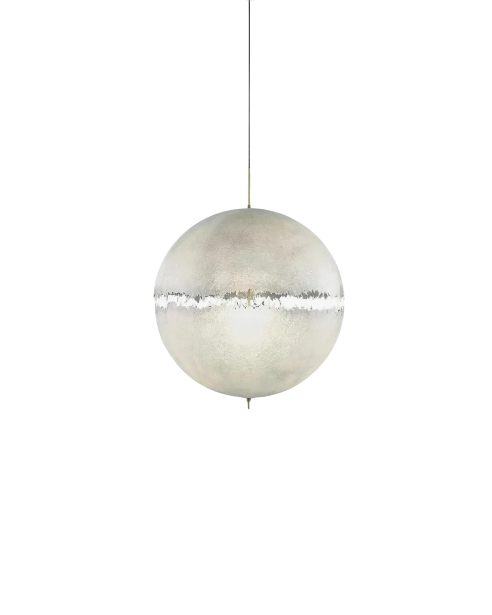 A large spherical diffuser creates a bold visual centerpiece. Its softened radiance recalls celestial forms and adds depth to open rooms. Perfect for foyers, dining areas, or high-ceiling spaces.