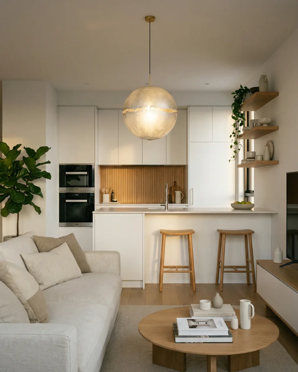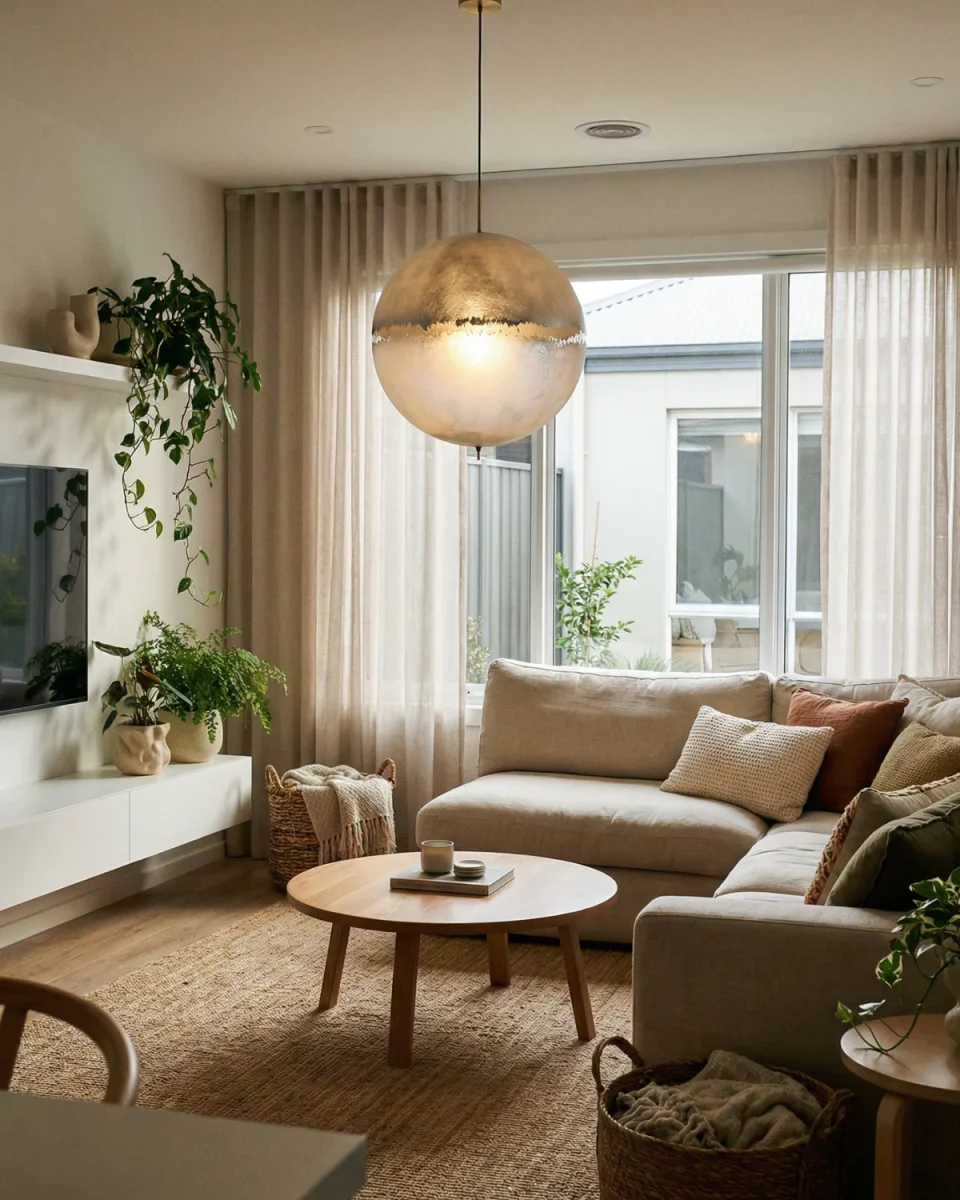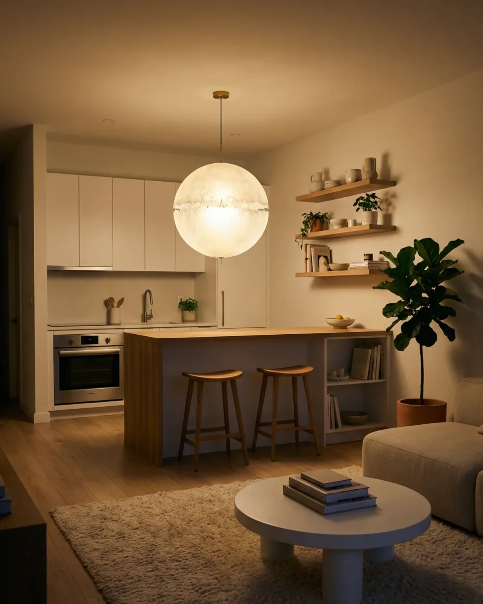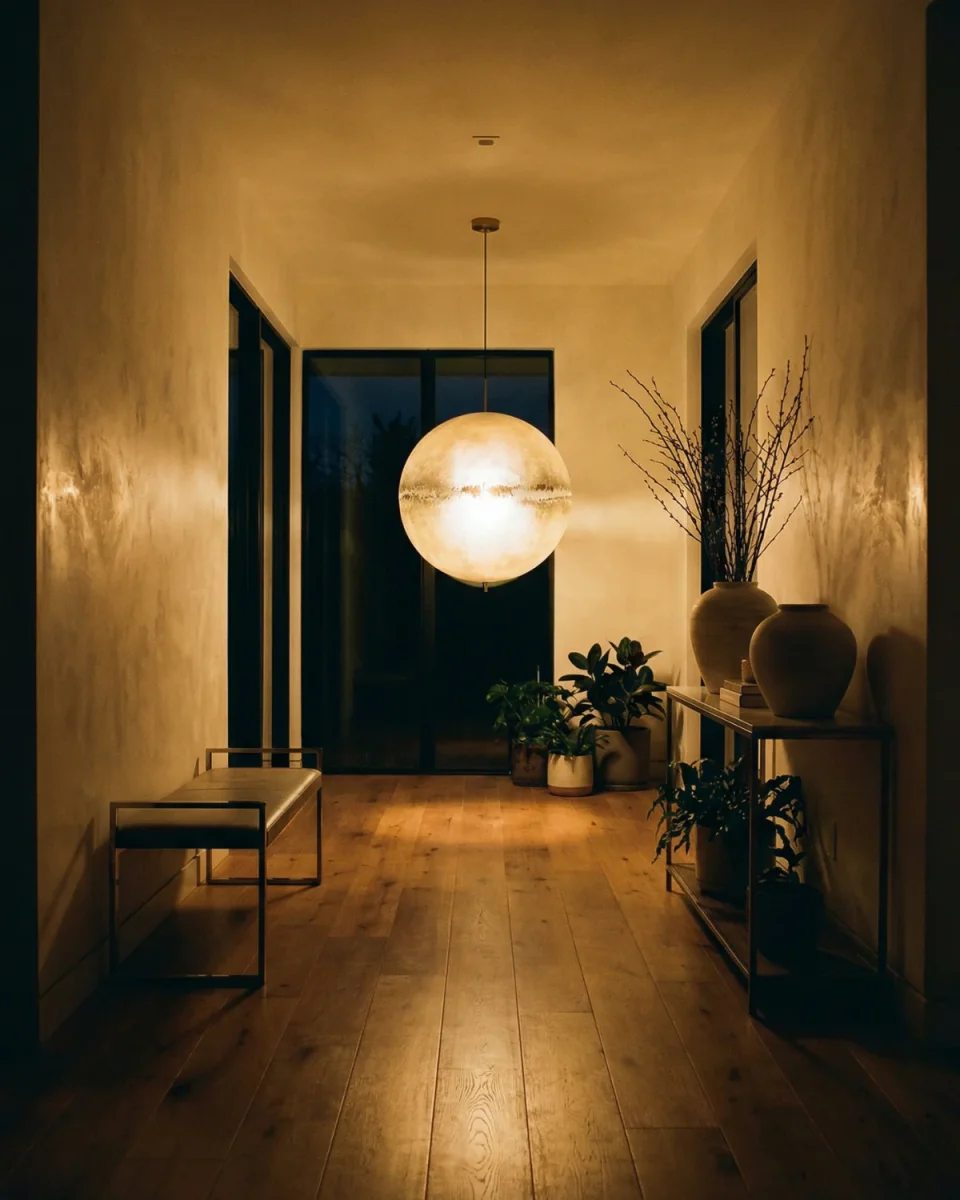 A large spherical diffuser creates a bold visual centerpiece. Its softened radiance recalls celestial forms and adds depth to open rooms. Perfect for foyers, dining areas, or high-ceiling spaces.